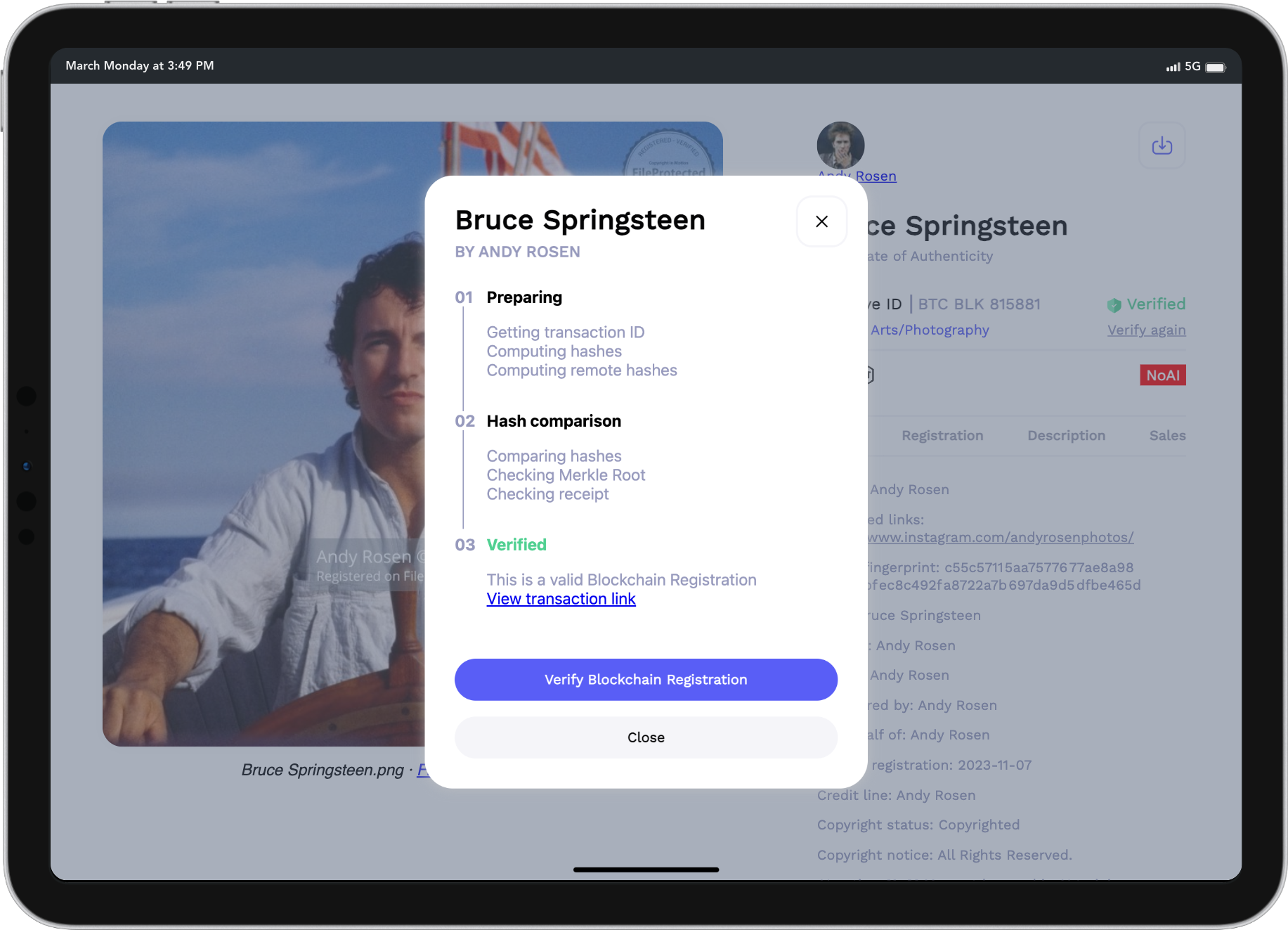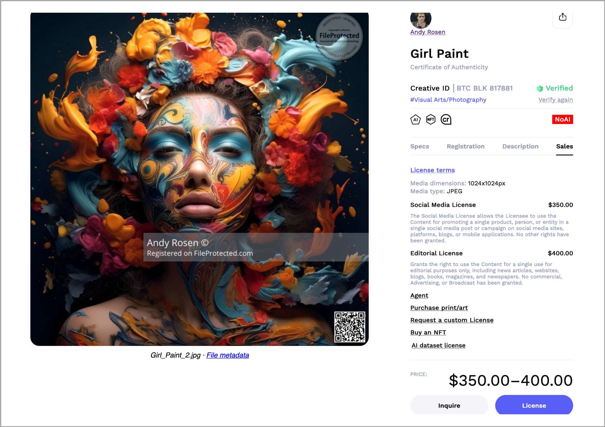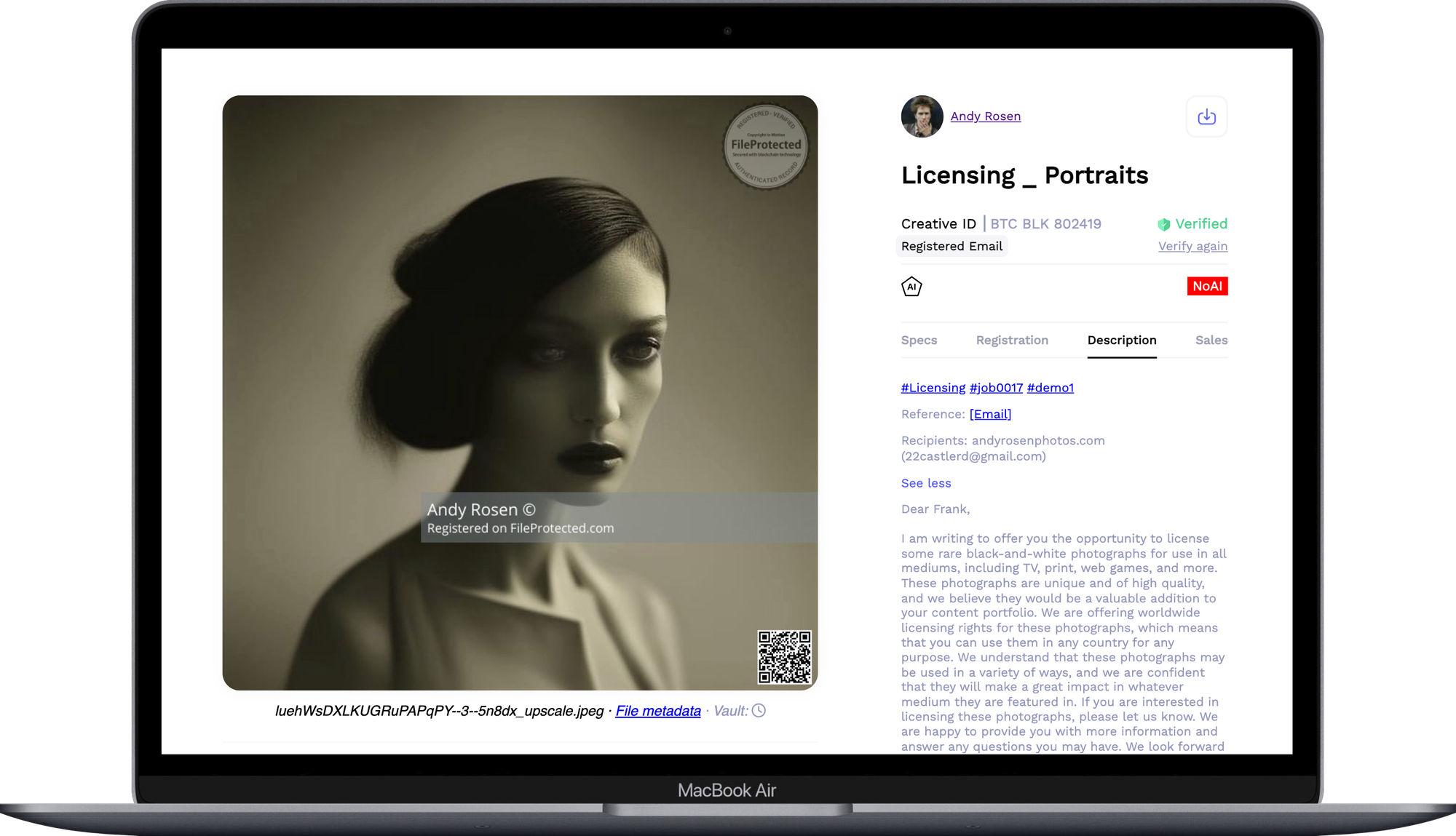 Our Creative ID acts as a permanent, secure record of your digital creations. By linking your work permanently with key information—such as ownership, collaborations, and copyright-supporting documents—this blockchain-based system makes proving authorship and documenting the creative journey seamless. In addition to protection, we offer tools like registered email, delivery, automatic Instagram registrations, and a marketplace for selling or licensing your work—without additional fees, allowing you to retain 100% of the sale! We strengthen our own verification processes by registering and aggregating verified metadata from trusted sources, if available, like Adobe's Content Credentials (C2PA) to ensure your work remains secure and ready for the future.