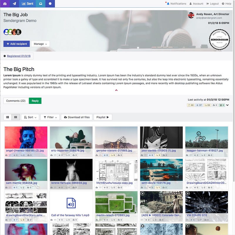 Sendergram provides a secure blockchain-enabled file sending, presentation, delivery and transaction platform for digital media for all creative types